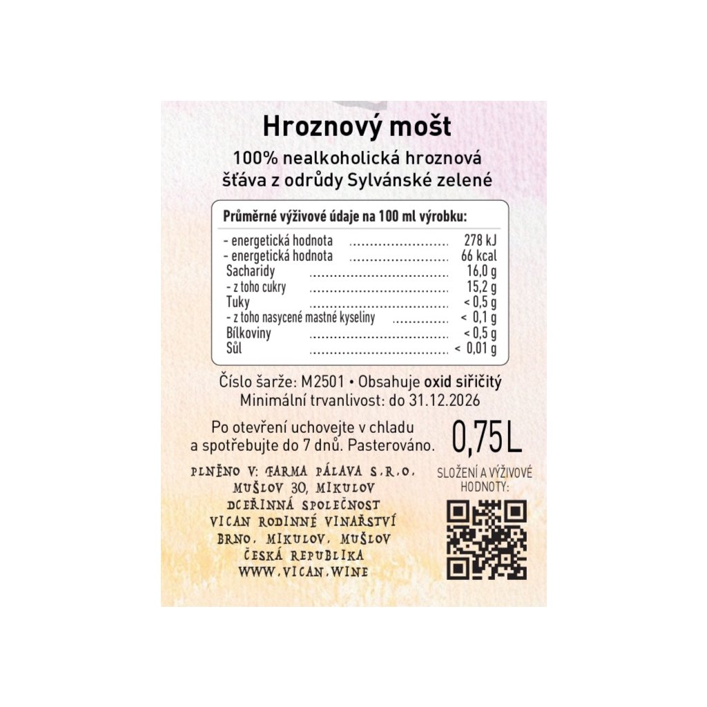 Čistá chuť Moravy v každé kapce! Náš hroznový mošt je lisován z hroznů odrůdy Sylvánské zelené, vypěstovaných na našich moravských vinicích. Bez chemie, jen jemně pasterizovaný a nefiltrovaný – plný přírodních látek a chuti, která vás osloví!